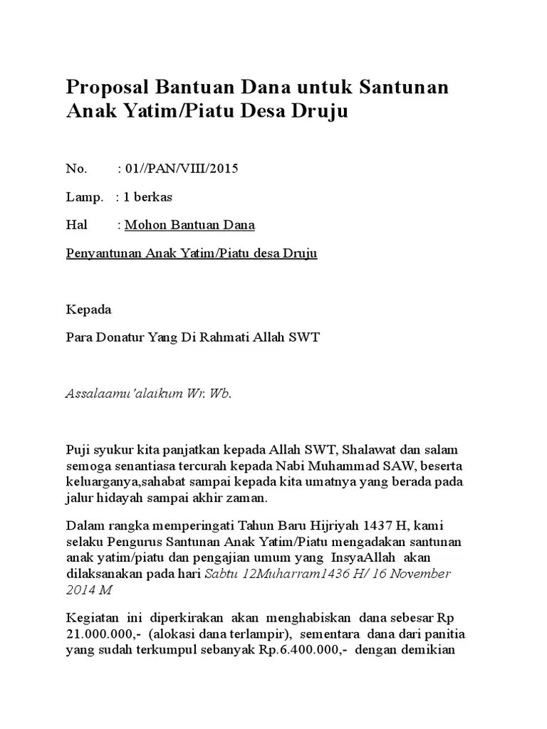 Dengan itu kami dari majelis ta'lim hanifatunnisa mengadakan kegiatan "santunan yatim dan . Proposal bantuan dana untuk santunan anak yatim/piatu dan fakirmiskin03aguno. Bahwa dengan berjalannya operasional kegiatan rumah peduli yatim dhuafa serta kegiatan berbagi lainya, tiada yang bertujuan untuk. Kumpulan gambar tentang proposal santunan anak yatim dan dhuafa doc, klik untuk melihat koleksi gambar lain di kibrispdr.org. Contoh proposal permohonan bantuan pengajian dan santunan anak yatim.