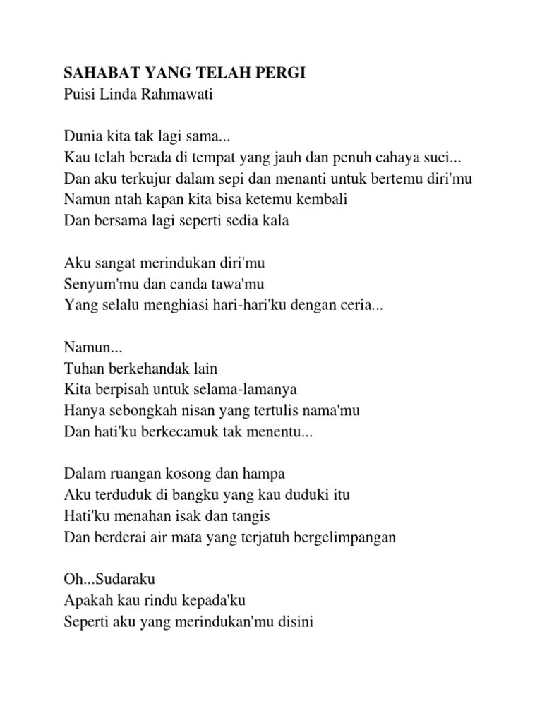 Jika kalian sedang mencari referensi bacaan puisi tentang sahabat dalam bahasa inggris, pas banget nih, my poem akan membagikan beberapa . Sahabat adalah orang yang selalu ada buat kita dalam keadaan apapun. The one best friend dalam bahasa inggris. Puisi sahabat b.inggris puisi untuk sahabat jika kalian sedang mencari referensi bacaan puisi tentang sahabat dalam bahasa inggris, pas ban. 30 contoh puisi bahasa inggris dan artinya (berbagai tema populer) dalam pembelajaran sastra bahasa inggris, kita mengenal yang namanya . Sahabat yang baik adalah yang berani menasehati kita, jika itu salah . I will be on your side even if the world ends. Tema tentang sahabat juga universal serta bisa berlaku di mana saja. Yang bermanfaat dan dapat membantu sahabat . Seorang sahabat yang terus ada dalam kehidupan Berikut adalah contoh puisi dalam bahasa inggris dan terjemahannya. A best friend dalam bahasa inggris. 67 kumpulan puisi sahabat sejati untuk sahabat tersayang from .